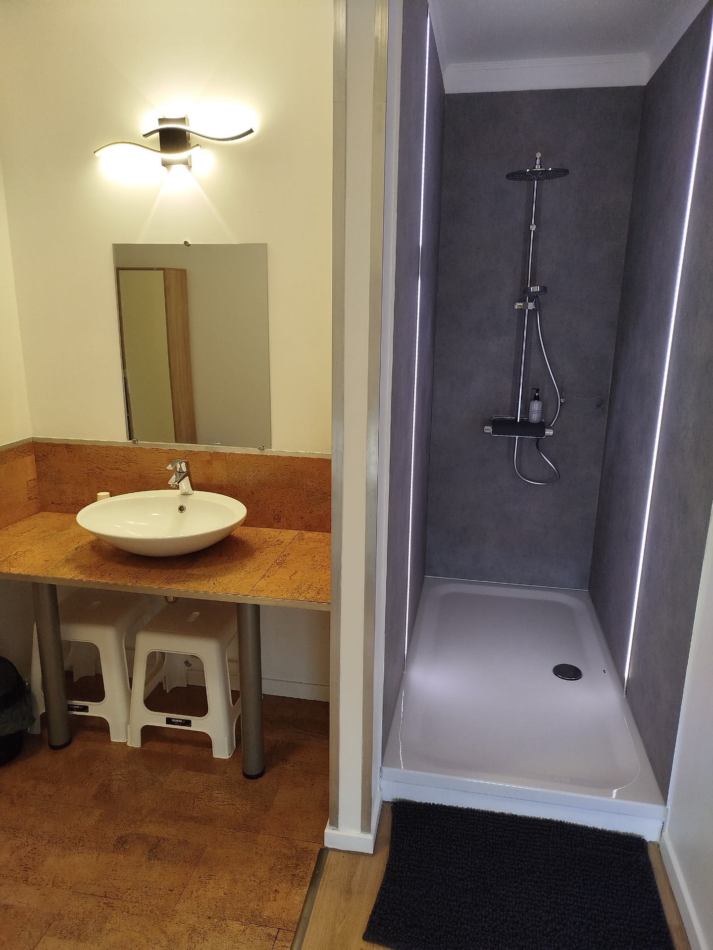 - 1 salle de bain avec lavabo et douche italienne et rangement