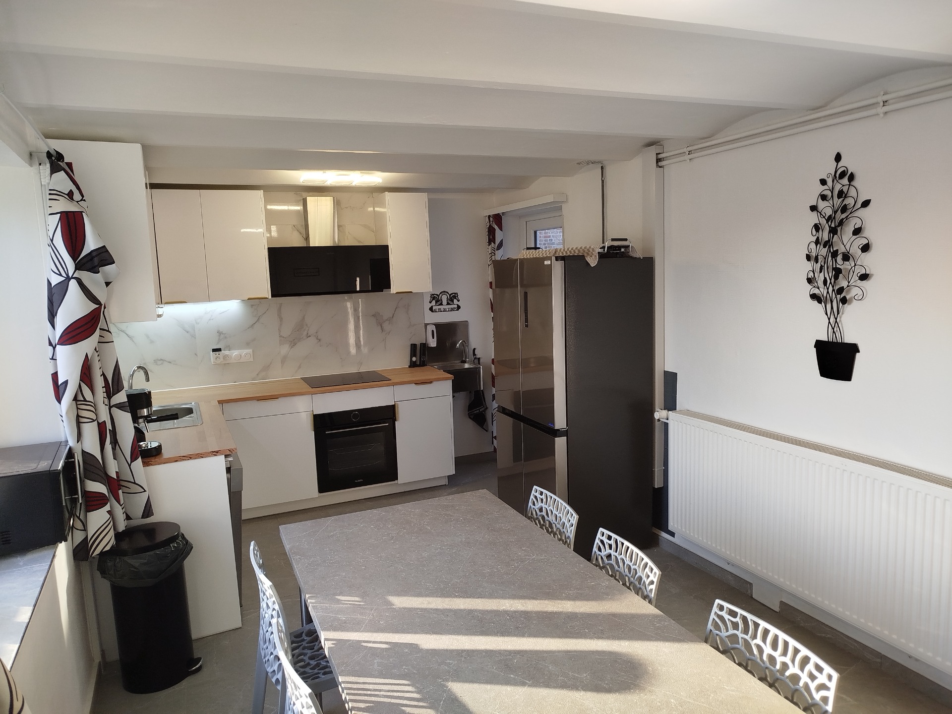 - 1 cuisine équipée avec partie repas ( table pouvant accueillir 9 personnes) four , plaque de cuisson , frigo table , lave-vaisselle, micro-ondes , percolateur, grill pain, lave-linge et frigo avec partie congélateur